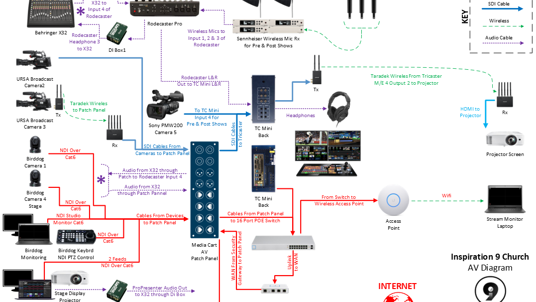 I worked along with the pastor to design a system which would work for their needs. This included recommending network and AV equipment for i9 to purchase. As equipment was ordered, I designed mobile media carts of which we had (2) built that would host the network, Tricaster switcher and console along with video monitors as well as wireless mic receivers, a small Rodecaster Pro audio mixer and a communications system.